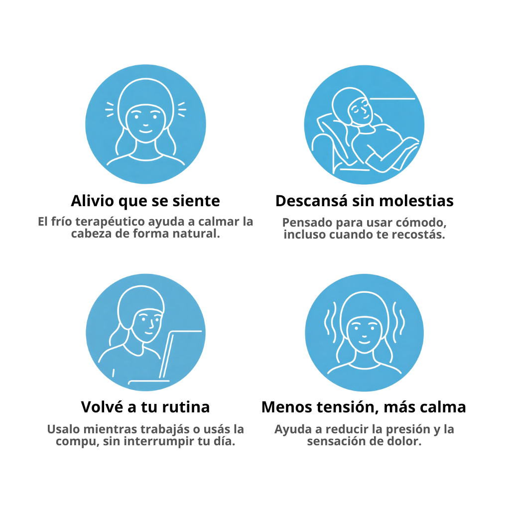 Sí. El diseño flexible y el gel suave permiten que el gorro se ajuste cómodamente a la cabeza sin necesidad de velcro ni presiones incómodas. Se mantiene en su lugar y podés usarlo mientras te recostás o descansás.